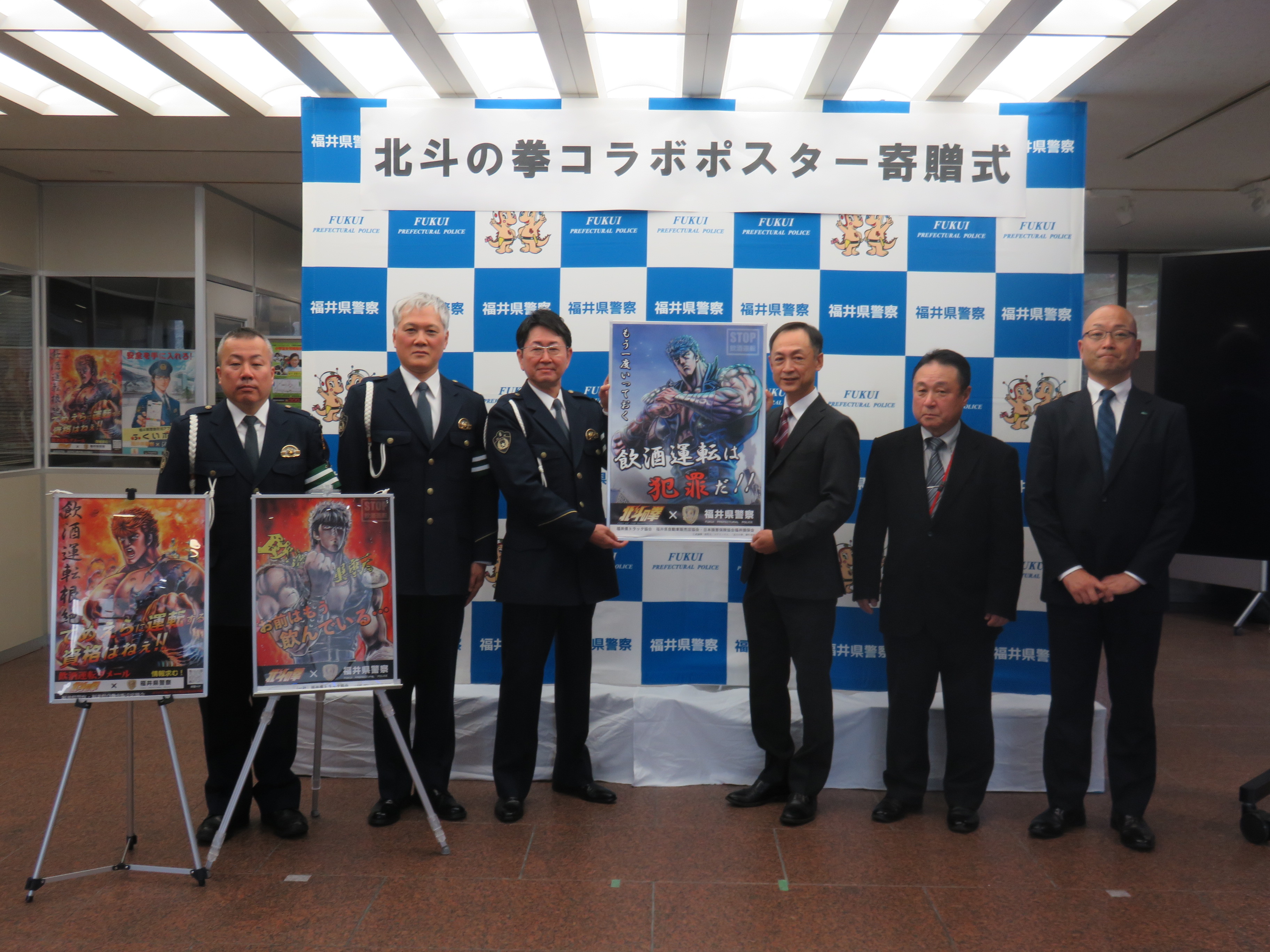 飲酒運転根絶を目指し、県内自動車関係団体と協力し「北斗の拳」とコラボした啓発ポスターを12月2日(火)に福井県警察本部に寄贈いたしました。
